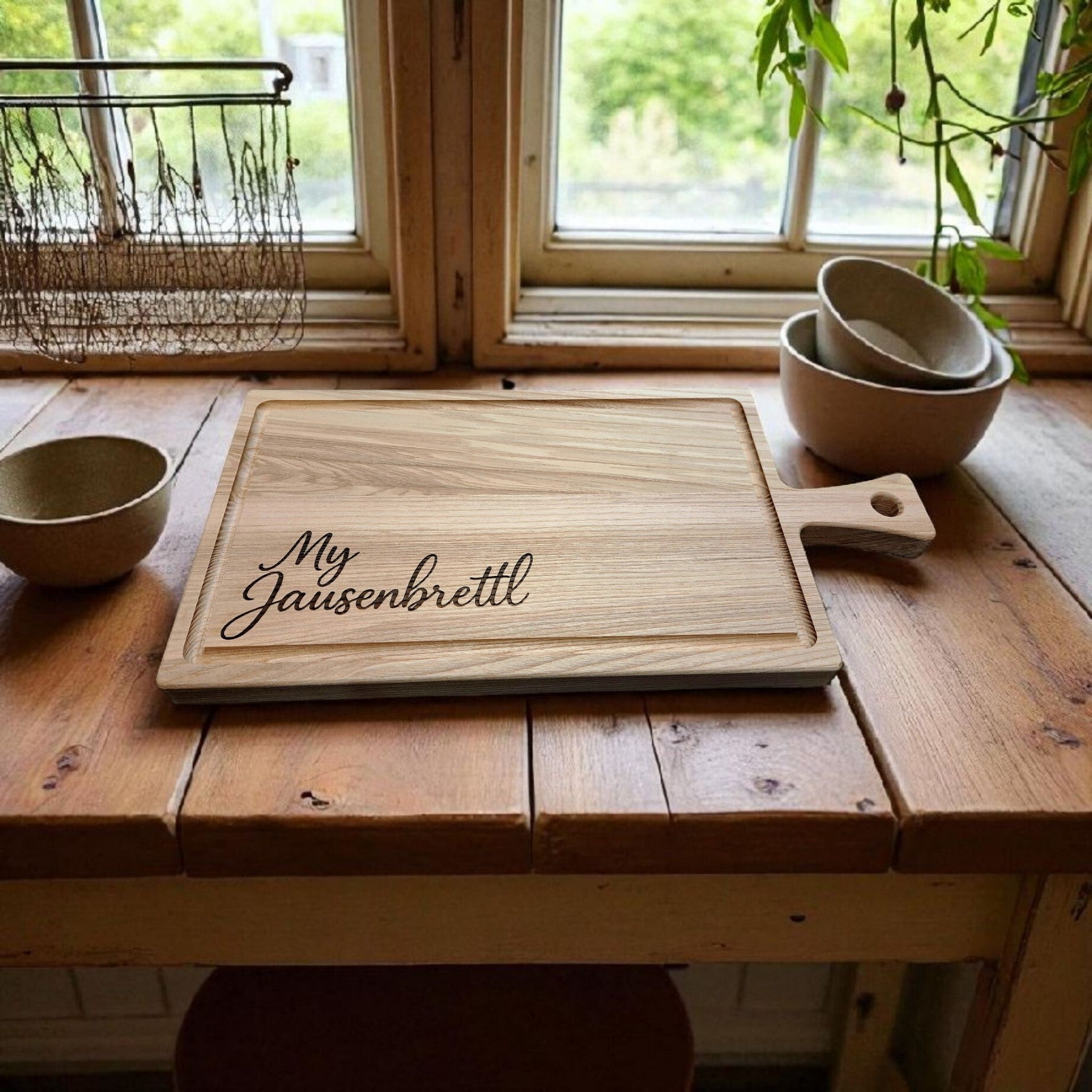 Du suchst nach dem perfekten Brettl für deine Jause, das nicht nur fesch aussieht, sondern auch was aushält? Dann ist unser Jausenbrettl mit Griff und Rille aus Eschenholz genau das Richtige für dich. Und das Beste kommt erst: Bei uns ist deine ganz persönliche Gravur immer schon im Preis mit dabei! Wir machen es dir so einfach wie möglich, dein persönliches Schneidebrett zu erhalten. Du kannst ganz unkompliziert deinen Wunschtext ins Bestellformular tippen oder sogar ein eigenes Bild hochladen – wir kümmern uns um den Rest. So wird dein Brettl zu einem echten Unikat, das sonst keiner hat.